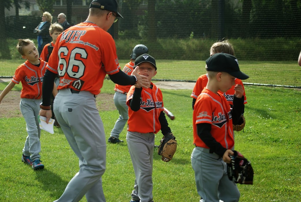 Beeball high fiveDe 3e inning begint sterk met een mooie slag van Diede. Fanny deelt weer een ferme tik uit en haalt daarmee Diede en Birk binnen, klasse! Sam raakt de bal eveneens stevig en weet Arvind binnen te brengen. En dan volgen een reeks mooie slagen van Lars, Nanne, CornĂ© en Jochem. Jochem tikt de bal zo stevig aan dat hij net als Fanny ook twee man weet binnen te brengen, super! Tot slot maakt Tygo het geheel af door als laatste slagman een homerun te slaan en de rest mee te nemen. Topscore deze inning: 9 van de 10 spelers hebben een punt gemaakt. Daar kunnen de Gryphons inderdaad niet tegenop: zij scoren in deze inning 8 punten, mede door een sterke veldactie van Sam. Vervolgens tikt Diede met de bal van de laatste slagman nog even twee Gryphons uit. Ondanks de sterke laatste inning van de Hazenkamp, halen we net niet genoeg punten binnen; we verliezen nipt met 16-17. Dat is jammer, maar belangrijker is dat onze Beeballers groeien in het spel en vooral ook het veldwerk. We hebben weer een fijne, leuk wedstrijd gespeeld. Hopelijk volgende week weer zo’n mooie dag als we thuis spelen tegen de Starlights.